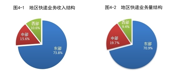 1—10月,東、中、西部地區(qū)快遞業(yè)務(wù)收入比重分別為73.8%、15.6%和10.6%,快遞業(yè)務(wù)量比重分別為70.9%、19.7%和9.4%。與去年同期相比,東部地區(qū)快遞業(yè)務(wù)收入比重下降0.9個(gè)百分點(diǎn),快遞業(yè)務(wù)量比重下降1.7個(gè)百分點(diǎn);中部地區(qū)快遞業(yè)務(wù)收入比重上升0.6個(gè)百分點(diǎn),快遞業(yè)務(wù)量比重上升1.1個(gè)百分點(diǎn);西部地區(qū)快遞業(yè)務(wù)收入比重上升0.3個(gè)百分點(diǎn),快遞業(yè)務(wù)量比重上升0.6個(gè)百分點(diǎn)。