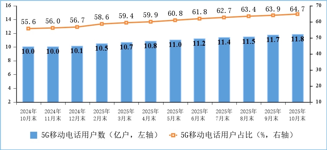 移動(dòng)電話(huà)用戶(hù)規(guī)模穩(wěn)中有增,5G用戶(hù)數(shù)持續(xù)增加。截至10月末,三家基礎(chǔ)電信企業(yè)及中國(guó)廣電的移動(dòng)電話(huà)用戶(hù)總數(shù)達(dá)18.3億戶(hù),比上年末凈增4015萬(wàn)戶(hù)。其中,5G移動(dòng)電話(huà)用戶(hù)達(dá)11.84億戶(hù),比上年末凈增1.7億戶(hù),占移動(dòng)電話(huà)用戶(hù)的64.7%。
