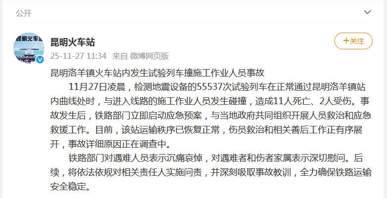 據(jù)昆明鐵路局昆明站官方微博消息,11月27日凌晨,檢測地震設(shè)備的55537次試驗(yàn)列車在正常通過昆明洛羊鎮(zhèn)站內(nèi)曲線處時(shí),與進(jìn)入線路的施工作業(yè)人員發(fā)生碰撞,造成11人死亡、2人受傷。事故發(fā)生后,鐵路部門立即啟動應(yīng)急預(yù)案,與當(dāng)?shù)卣餐M織開展人員救治和應(yīng)急救援工作。目前,該站運(yùn)輸秩序已恢復(fù)正常,傷員救治和相關(guān)善后工作正有序展開,事故詳細(xì)原因正在調(diào)查中。