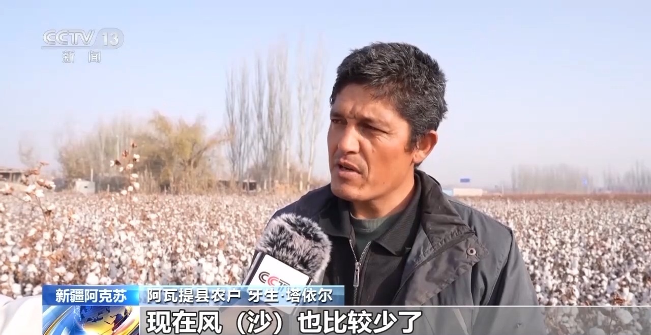 阿瓦提縣農(nóng)戶(hù) 牙生·塔依爾:種樹(shù)之后天氣變得很好,現(xiàn)在風(fēng)沙也比較少了,棉花白白的,以前棉花上黃黃的,土太多了,以前一畝地200到250公斤,現(xiàn)在350公斤。