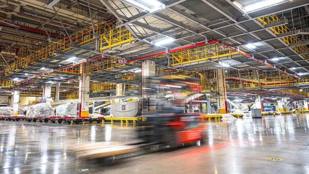 跟隨轉(zhuǎn)運(yùn)車,記者來(lái)到了建筑面積達(dá)75萬(wàn)平方米的機(jī)場(chǎng)“工”字形轉(zhuǎn)運(yùn)中心。這里,“快點(diǎn)、快點(diǎn)”的催促聲與機(jī)器有節(jié)律的運(yùn)行聲形成交響,在2萬(wàn)多臺(tái)自動(dòng)分揀設(shè)備和50多公里長(zhǎng)傳送帶的支持下,工人們熟練地將數(shù)量規(guī)格不一的包裹抱起、分類、組合、打包,再拼裝出多個(gè)符合航空貨運(yùn)規(guī)格和形狀要求的大包裹。