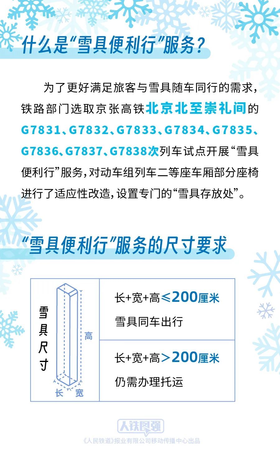 鐵路部門堅持以人民為中心的發(fā)展思想,持續(xù)深化運輸供給側(cè)結(jié)構(gòu)性改革,積極適應(yīng)旅客多樣化的出行需求,為攜帶雪具出行的旅客提供便捷服務(wù)。前期,鐵路部門按照《國鐵集團(tuán)鐵路旅客運輸規(guī)程》“旅客乘坐動車組列車隨身攜帶的行李物品長、寬、高之和不超過130厘米”的規(guī)定,對超過上述尺寸標(biāo)準(zhǔn)的雪具推出了“雪具快運”服務(wù)。為了更好滿足旅客與雪具隨車同行的需求,鐵路部門統(tǒng)籌考慮旅客安全、乘車秩序和雪具運輸需求,選取京張高鐵北京北至崇禮間的G7831、G7832、G7833、G7834、G7835、G7836、G7837、G7838次列車試點開展“雪具便利行”服務(wù),對動車組列車二等座車廂部分座椅進(jìn)行了適應(yīng)性改造,設(shè)置專門的“雪具存放處”,旅客選擇該服務(wù)后可攜帶長、寬、高之和不超過200厘米的雪具同車出行,滑雪更加方便快捷。對于長、寬、高之和超過200厘米的雪具,由于高鐵列車車內(nèi)空間限制,仍需辦理托運。