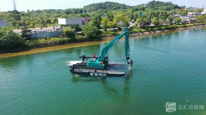 只見一臺身披“山河綠”的水陸兩棲挖掘機穩(wěn)穩(wěn)地在水中行駛。駕駛室里的工程師輕拉搖桿,這個足有兩層樓高的“鋼鐵巨獸”便靈活轉身,履帶劃過水面,泛起層層漣漪——輕巧的身姿完全顛覆了人們對挖掘機“只能在地上笨重行走”的固有印象。