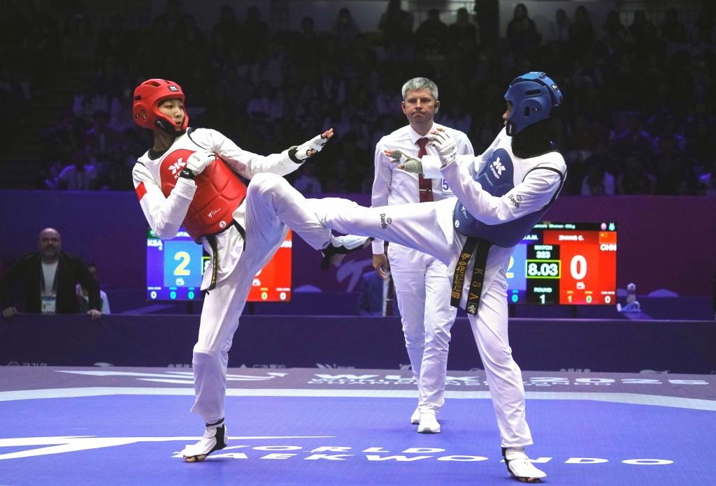 圖為10月30日在江蘇無(wú)錫舉行的一場(chǎng)2025年世界跆拳道錦標(biāo)賽比賽。新華社發(fā)(劉臻睿攝)