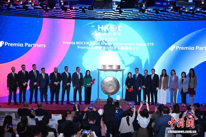 2025年5月29日,香港交易及結(jié)算所有限公司與沙特阿拉伯證券交易所集團在香港合辦“香港——沙特資本市場論壇”。現(xiàn)場亦舉行Premia中銀香港沙特伊斯蘭國債交易所買賣基金(ETF)在香港上市的敲鑼儀式。圖為香港特區(qū)政府財政司司長陳茂波(右七)等嘉賓出席敲鑼儀式。 中新社記者 李志華 攝