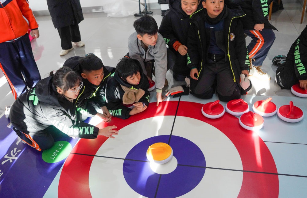 12月3日,吉林市松江東路小學(xué)校學(xué)生在吉林市納美山谷度假區(qū)體驗旱地冰壺。新華社記者 顏麟蘊(yùn) 攝