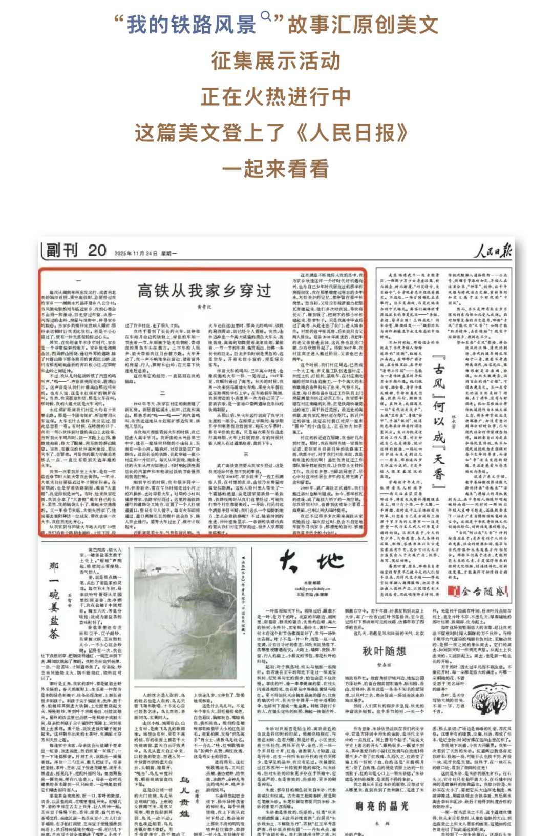 2025年,中宣部文明創(chuàng)建局、中央網(wǎng)信辦網(wǎng)絡(luò)傳播局、廣電總局宣傳司、中國(guó)作協(xié)創(chuàng)聯(lián)部、國(guó)鐵集團(tuán)黨組宣傳部聯(lián)合開展三季“我的鐵路風(fēng)景”主題宣傳活動(dòng),人民日?qǐng)?bào)、央視新聞、新華網(wǎng)客戶端、學(xué)習(xí)強(qiáng)國(guó)、中國(guó)文明網(wǎng),抖音、微博、小紅書和“中國(guó)鐵路”全媒體等20余個(gè)平臺(tái)傾力承辦,共征集到原創(chuàng)作品76萬(wàn)余個(gè),展示傳播7萬(wàn)余個(gè),話題傳播量超90億人次。