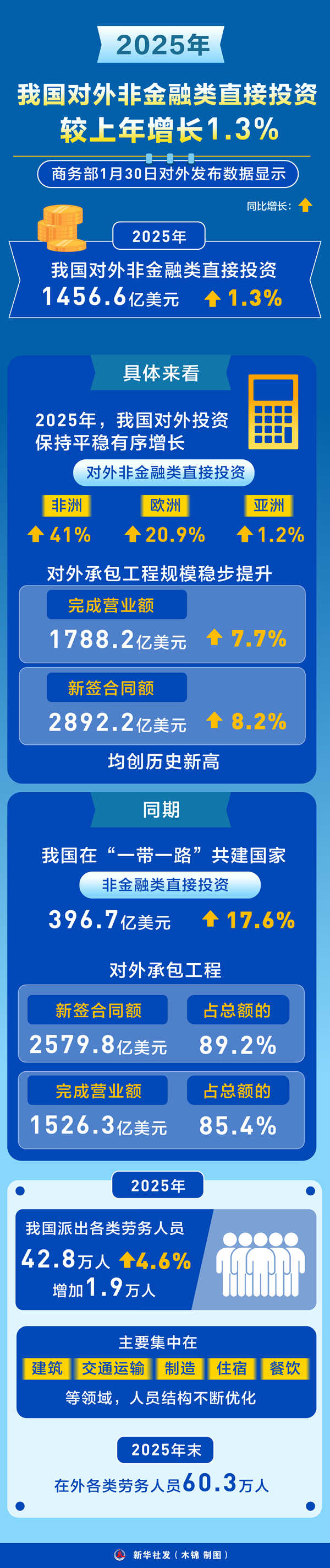 2025年,我國(guó)派出各類(lèi)勞務(wù)人員42.8萬(wàn)人,較上年增長(zhǎng)4.6%,增加1.9萬(wàn)人,主要集中在建筑、交通運(yùn)輸、制造、住宿和餐飲等領(lǐng)域,人員結(jié)構(gòu)不斷優(yōu)化。2025年末,在外各類(lèi)勞務(wù)人員60.3萬(wàn)人。
