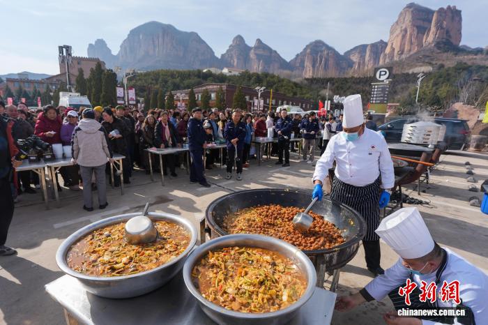 除了非遺展區(qū),在場地一側(cè)安排的“千人百桌宴”也提前烘托出濃濃年味。偌大的場地內(nèi),10人一桌的圓桌分4列排開,近千人同時用餐,“大燴菜、開花饃,廚師現(xiàn)場制作的飯菜熱氣騰騰,胃口一下就打開了”。