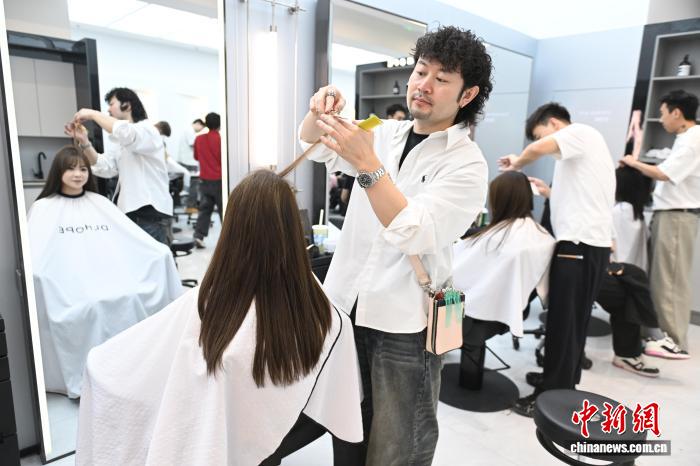 理發(fā)師為年輕顧客染發(fā)。 中新網記者 劉文華 攝