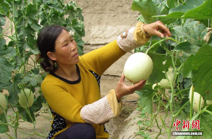 2月初,甘肅省武威市民勤縣種植戶查看玉菇甜瓜長(zhǎng)勢(shì)。馬愛(ài)彬 攝
