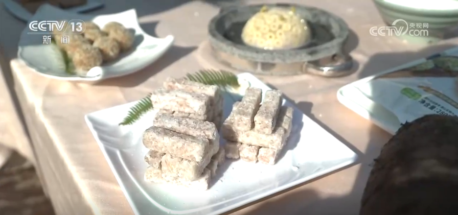 除了好看,當(dāng)然也有好吃的。當(dāng)?shù)氐募t糖年糕寓意著“年年高、步步高”。還有一道是用本地檳榔芋做成的掛霜芋,將芋塊加入白糖翻炒,表面裹上一層細細的糖霜,粉粉糯糯,是每家每戶逢年過節(jié)的必備菜肴。