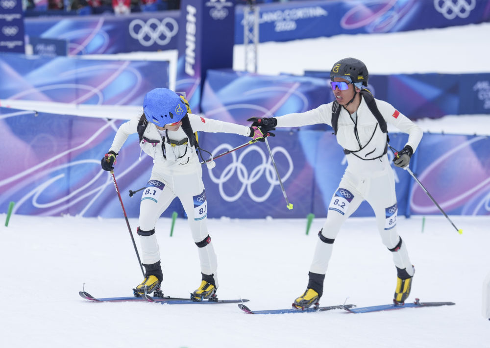 2026年2月19日,布魯爾(后)與隊(duì)友次旦玉珍在米蘭-科爾蒂納冬奧會(huì)滑雪登山混合接力比賽中。新華社記者 胡虎虎 攝