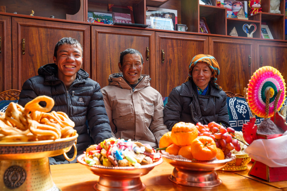 次旦玉珍的父親旦增群培(中)、母親德吉卓瑪(右)和弟弟達(dá)瓦頓珠坐在家中,背后的書架上擺放著許多次旦玉珍的參賽照片和參賽紀(jì)念品(2026年2月7日攝)。新華社記者 丁增尼達(dá) 攝