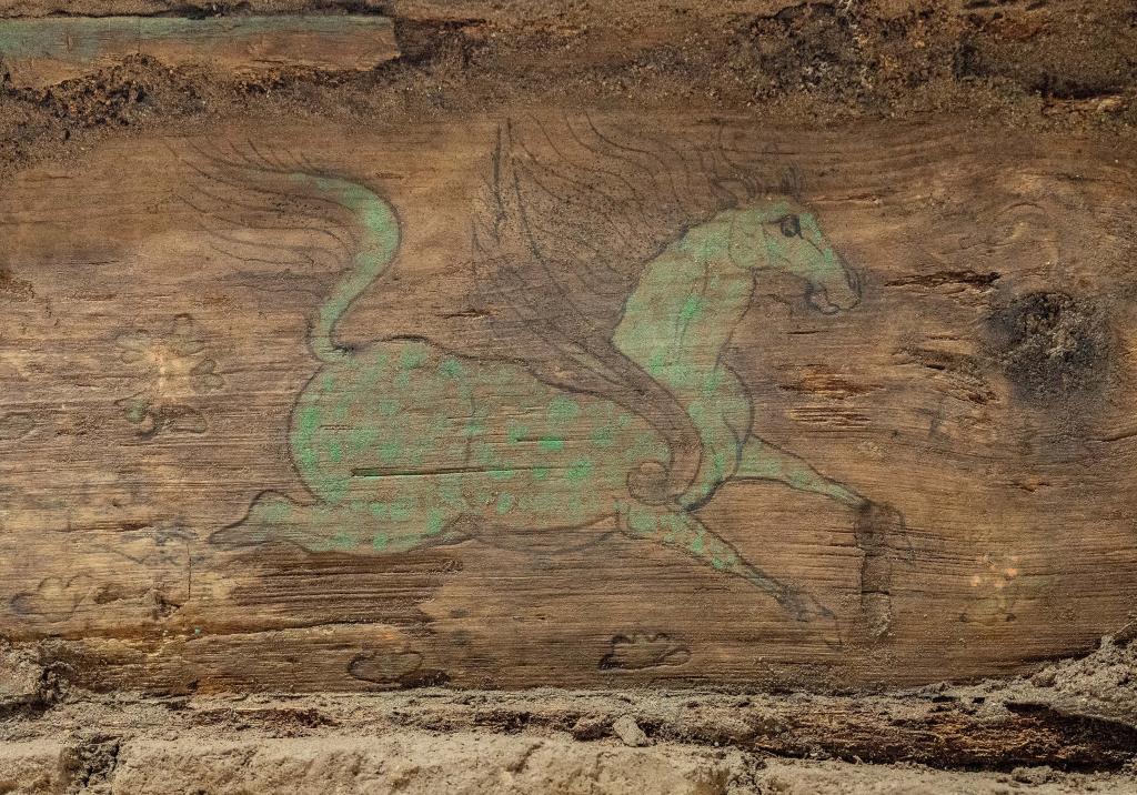 這是木棺座壸門(mén)內(nèi)的彩繪“翼馬”圖案。新華社記者 李賀 攝