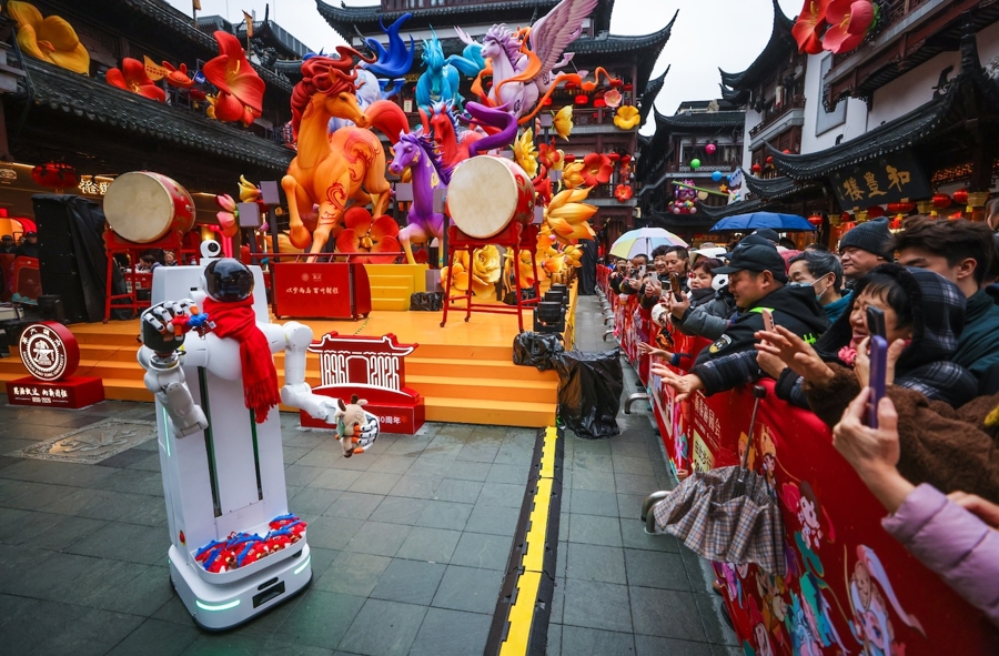 圖為由上海交通大學(xué)、上海人工智能研究院孵化的具身智能創(chuàng)業(yè)企業(yè),在豫園燈會(huì)中心廣場(chǎng)精心打造了一個(gè)未來感十足的智能互動(dòng)區(qū)。文匯報(bào)記者袁婧攝