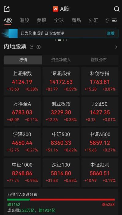 全市成交額2.22萬億,超4200只個股上漲。