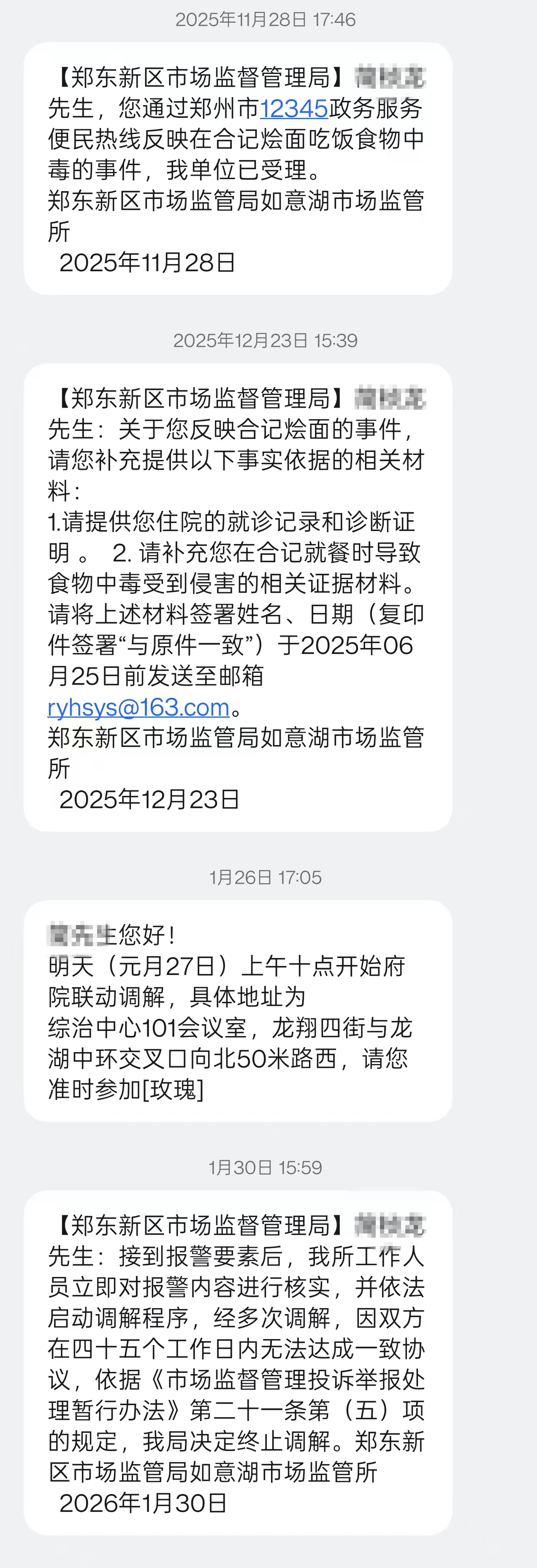 此后,鄭東新區(qū)市場(chǎng)監(jiān)督管理局向簡(jiǎn)先生表示:經(jīng)多次調(diào)解,因雙方在四十五個(gè)工作日內(nèi)無法達(dá)成一致協(xié)議,依據(jù)《市場(chǎng)監(jiān)督管理投訴舉報(bào)處理暫行辦法》第二十一條第(五)項(xiàng)的規(guī)定,我局決定終止調(diào)解。