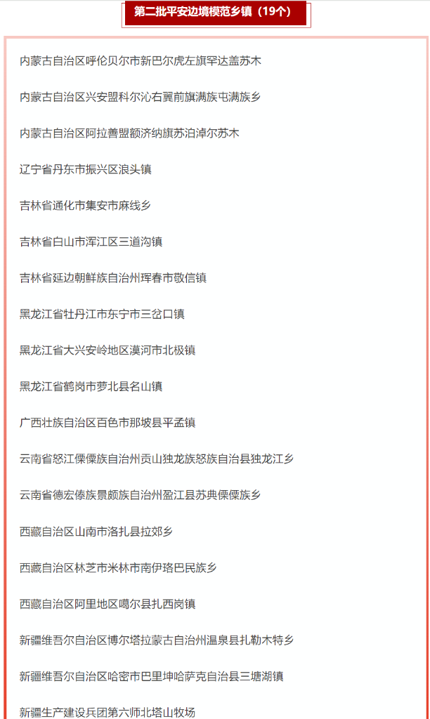 19個(gè)第二批平安邊境模范鄉(xiāng)鎮(zhèn)名單。(國(guó)家移民管理局微信公眾號(hào)截圖)