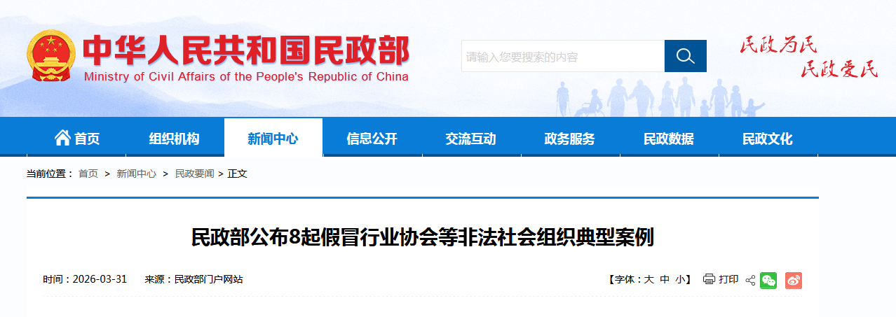 中國(guó)網(wǎng)3月31日訊 民政部網(wǎng)站今日公布8起假冒行業(yè)協(xié)會(huì)等非法社會(huì)組織典型案例,具體如下: