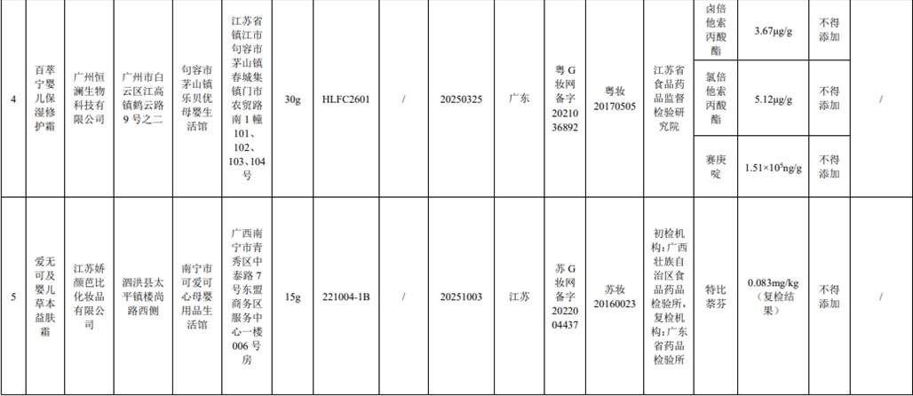 記者注意到,這6批次化妝品中還出現了嬰童用品。其中,產品標簽標示為廣州恒瀾生物科技有限公司生產的百萃寧嬰兒保濕修護霜檢出不得添加的鹵倍他索丙酸酯、氯倍他索丙酸酯、賽庚啶。