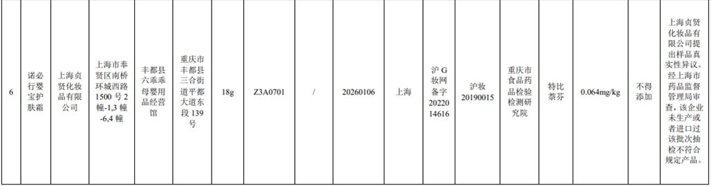 產品標簽標示為上海貞賢化妝品有限公司生產的諾必行嬰寶護膚霜檢出不得添加的特比萘芬。(備注:上海貞賢化妝品有限公司提出樣品真實性異議。經上海市藥品監(jiān)督管理局審查,該企業(yè)未生產或者進口過該批次抽檢不符合規(guī)定產品。)