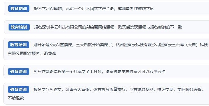 然而,“人民投訴”經(jīng)梳理發(fā)現(xiàn),網(wǎng)絡(luò)上不少消費(fèi)者吐槽相關(guān)課程質(zhì)量良莠不齊,與廣告承諾“免費(fèi)領(lǐng)取AI應(yīng)用體驗(yàn)課及AI工具”“低投入、高回報(bào)”“副業(yè)賺錢”“快速變現(xiàn)”等內(nèi)容大相徑庭。相關(guān)商家虛假宣傳、誘導(dǎo)消費(fèi)、貨不對(duì)板以及退費(fèi)難等問(wèn)題被反復(fù)提及。