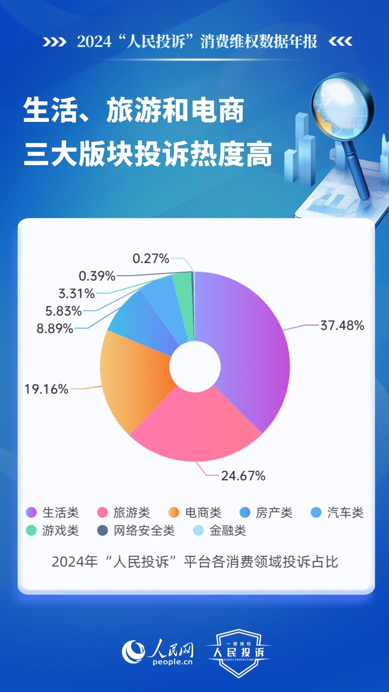 據(jù)統(tǒng)計,在網(wǎng)友投訴的消費(fèi)重點(diǎn)領(lǐng)域,生活類占比37.48%、旅游類24.67%、電商類19.16%、房產(chǎn)類8.89%、汽車類5.83%、游戲類3.31%、網(wǎng)絡(luò)安全類0.39%、金融類0.27%。其中,生活、旅游和電商三大版塊投訴熱度較高。
