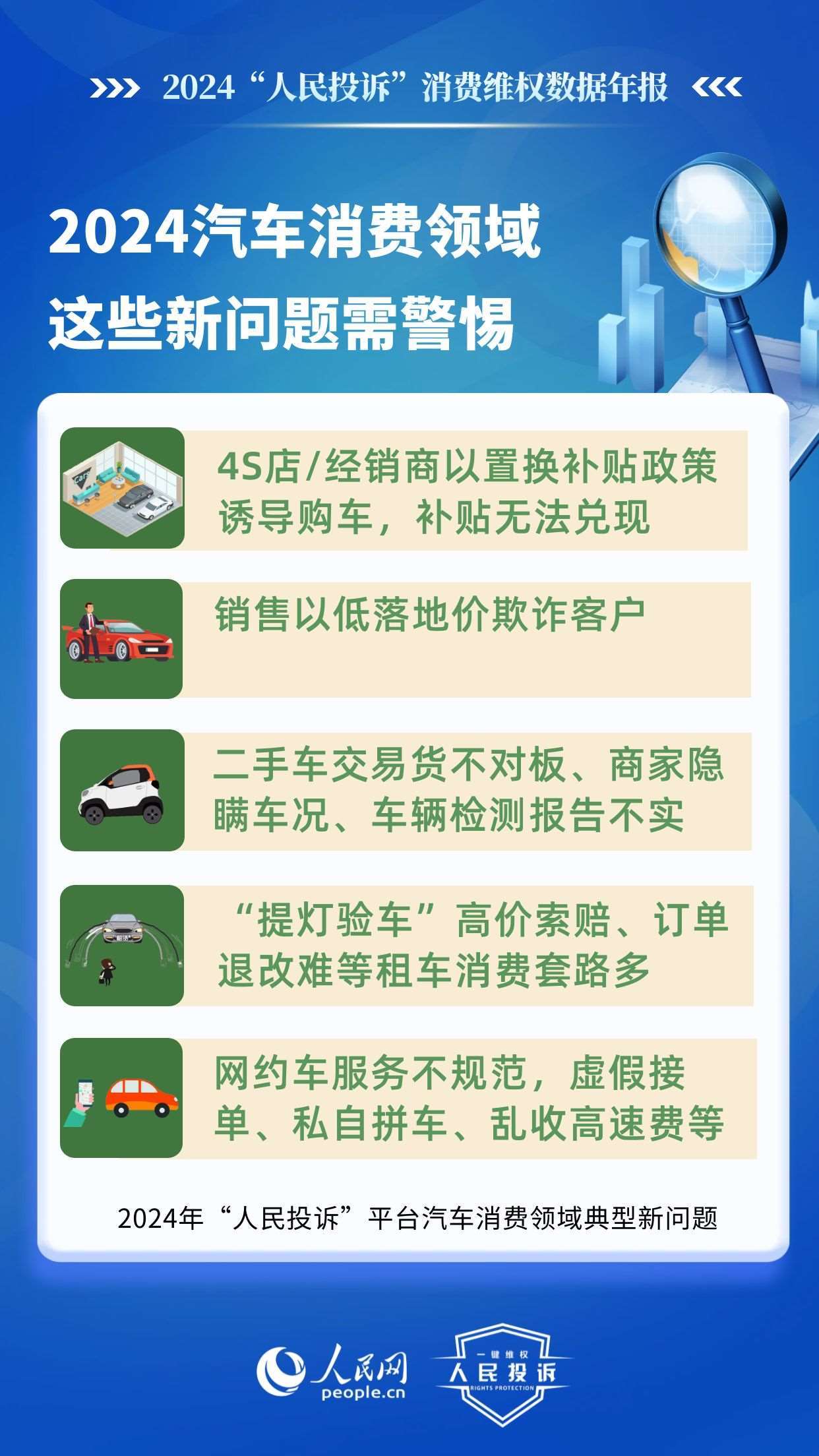 新問題體現(xiàn)在:4S店/經(jīng)銷商以置換補(bǔ)貼政策誘導(dǎo)購車,結(jié)果補(bǔ)貼無法兌現(xiàn);銷售以低落地價欺詐客戶;二手車交易貨不對板、商家隱瞞車況、平臺車輛檢測報告不實(shí);惡意租“故障車”、“提燈驗(yàn)車”高價索賠、低價誘租、訂單退改難等租車消費(fèi)套路多;網(wǎng)約車服務(wù)不規(guī)范,人車不符、虛假接單、私自拼車、亂收高速費(fèi)等。