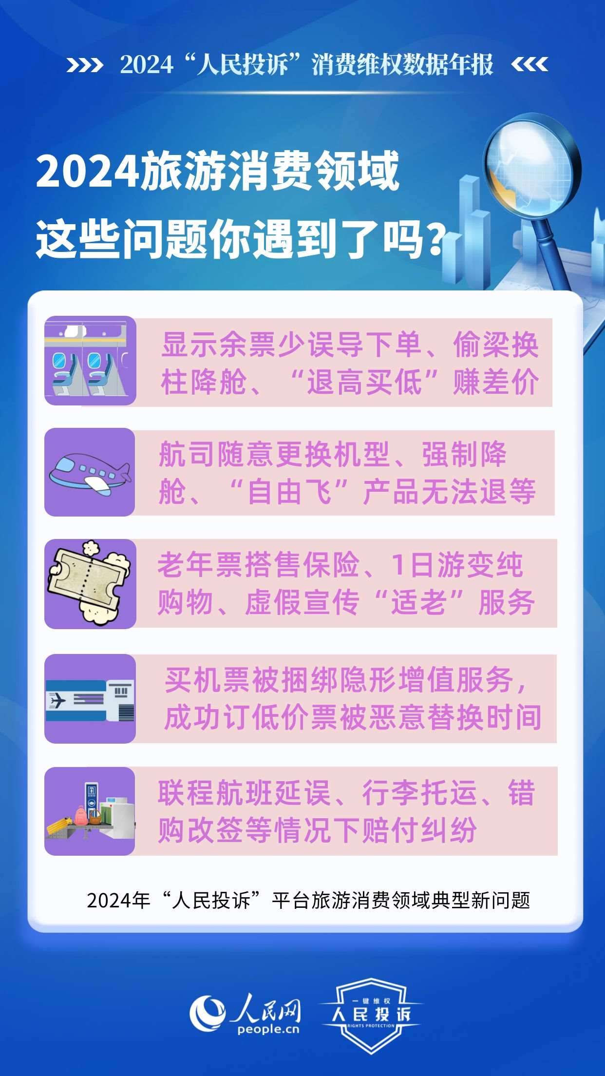 2024年,旅游消費(fèi)持續(xù)火爆,以舊換新“換”出消費(fèi)新活力,直播電商“品質(zhì)化”轉(zhuǎn)型,新能源汽車購銷兩旺……在消費(fèi)市場熱力持續(xù)提升的背景下,旅游產(chǎn)品退訂難,電商促銷虛假價保,直播間營銷違規(guī),車險車貸服務(wù)欺詐,AI培訓(xùn)貨不對板等消費(fèi)侵權(quán)問題引發(fā)廣泛關(guān)注。“人民投訴”發(fā)布年報帶您回顧這一年來,平臺消費(fèi)維權(quán)熱點(diǎn)和入駐企業(yè)積極處理糾紛的舉措。