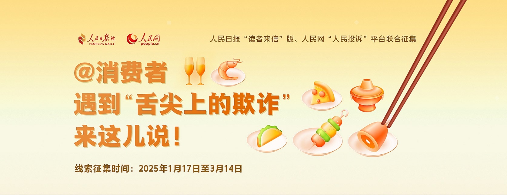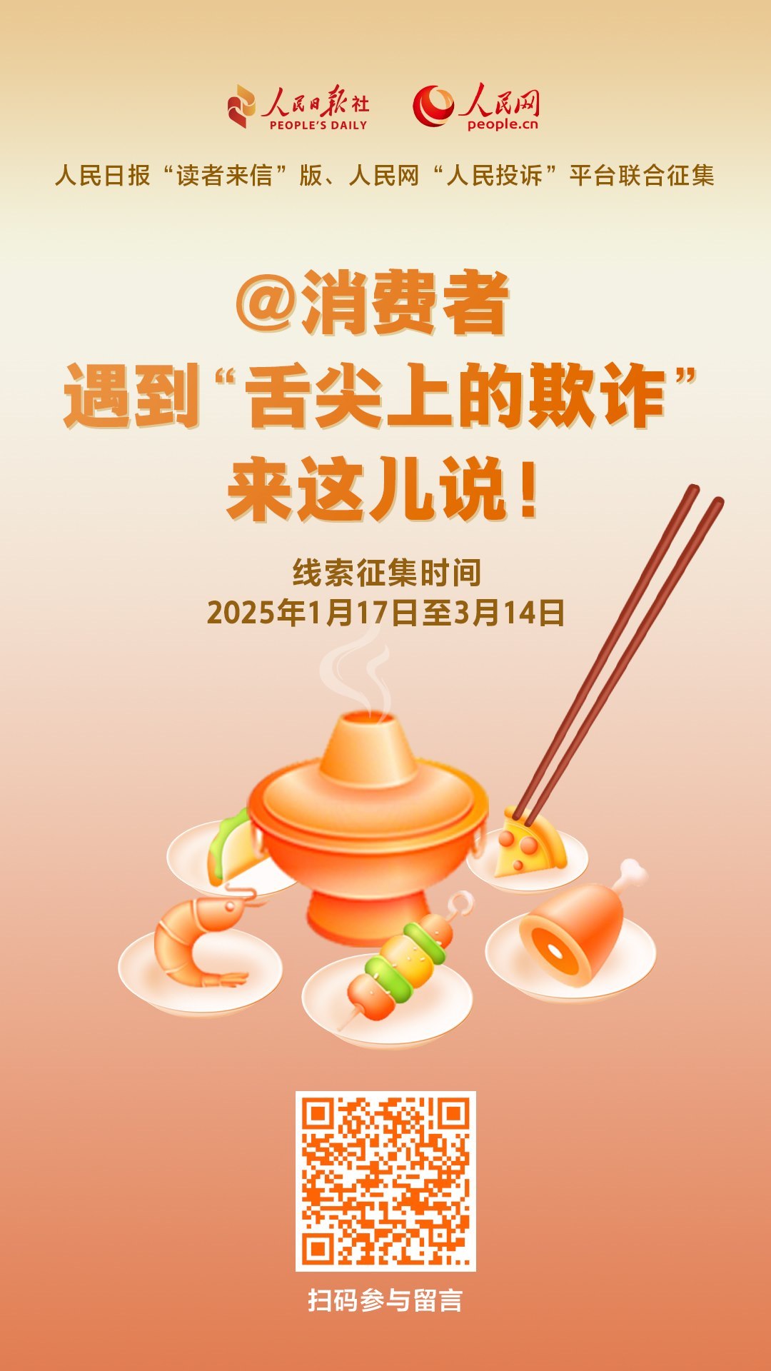 牛肉干里不含牛肉,無(wú)糖產(chǎn)品其實(shí)含糖,配料表造假、營(yíng)養(yǎng)成分表不準(zhǔn)確……你遇到過(guò)嗎?“以假亂真”“以次充好”為代表的食品欺詐,嚴(yán)重?fù)p害消費(fèi)者利益,擾亂市場(chǎng)公平競(jìng)爭(zhēng)秩序。為筑牢食品安全防線(xiàn),增強(qiáng)消費(fèi)者信心,即日起,人民日?qǐng)?bào)“讀者來(lái)信”版與人民網(wǎng)“人民投訴”平臺(tái)聯(lián)合發(fā)起相關(guān)線(xiàn)索征集,歡迎您掃描上方海報(bào)二維碼進(jìn)入征集頁(yè)面留言或提供調(diào)查線(xiàn)索至人民日?qǐng)?bào)“讀者來(lái)信”版(郵箱:dzlx@peopledaily.cn 傳真:010-65368495)。線(xiàn)索征集時(shí)間截至2025年3月14日。