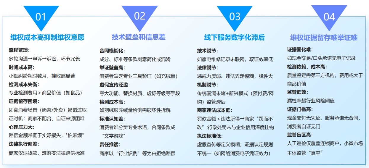 通過(guò)對(duì)消費(fèi)維權(quán)新老問(wèn)題的梳理和分析,“人民投訴”認(rèn)為,傳統(tǒng)問(wèn)題多因信息不對(duì)稱和監(jiān)管漏洞,而新難題則疊加了技術(shù)復(fù)雜性(如算法操控)和新業(yè)態(tài)模式(如直播、盲盒),維權(quán)難度升級(jí)。