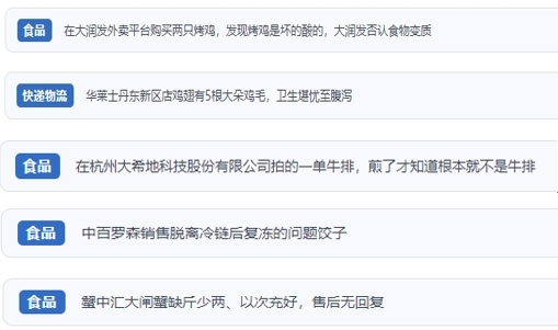 “人民投訴”上不少網(wǎng)友反映,“外賣商家銷售排骨套餐中含過期飲料”“外賣店鋪吃出蟑螂,商家不按照食品安全法賠償” “直播間購買車?yán)遄?,虛假宣?J、原裝進口,到貨嚴(yán)重貨不對板”“網(wǎng)購東北珍珠貢米,到貨包裝上執(zhí)行標(biāo)準(zhǔn)是廢止的標(biāo)準(zhǔn)”“超市買的梅花肉切開發(fā)現(xiàn)是淋巴肉”“平臺商家承諾枸杞不熏硫酸,實則檢測后含硫超標(biāo)”“知名便利店售賣脫離冷鏈后多次復(fù)凍的餃子”等。