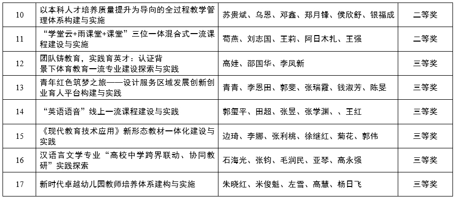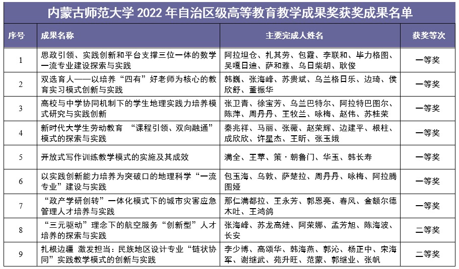 北疆新聞網(wǎng)、北疆新聞APP、北疆云消息(記者 李艷紅)近日,內(nèi)蒙古自治區(qū)教育廳發(fā)布了《關(guān)于公布2022年自治區(qū)級高等教育教學(xué)成果獎獲獎成果的通知》,內(nèi)蒙古師范大學(xué)微官網(wǎng)由數(shù)學(xué)科學(xué)學(xué)院牽頭、黨委書記阿拉坦倉主持的《思政引領(lǐng)、實踐創(chuàng)新和平臺支撐三位一體的數(shù)學(xué)一流專業(yè)建設(shè)與實踐》等17個推薦至自治區(qū)的教學(xué)成果均獲獎,實現(xiàn)了100%的獲獎率。其中,一等獎7項,二等獎4項,三等獎6項。一等獎獲獎數(shù)量及總獲獎率位居全區(qū)之首。