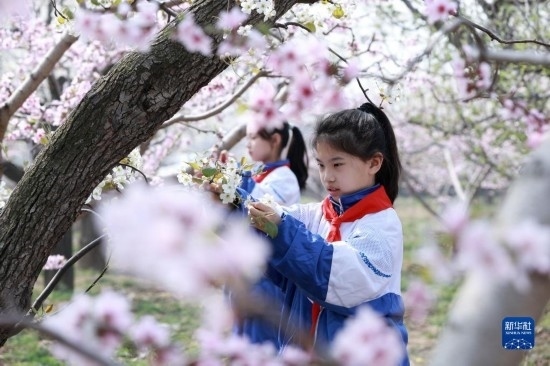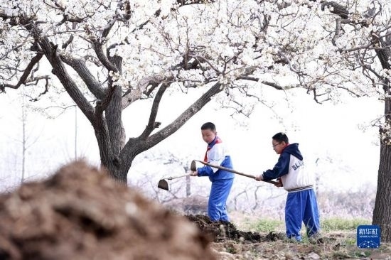 3月28日,內丘縣大都城小學學生在梨園疏花。
