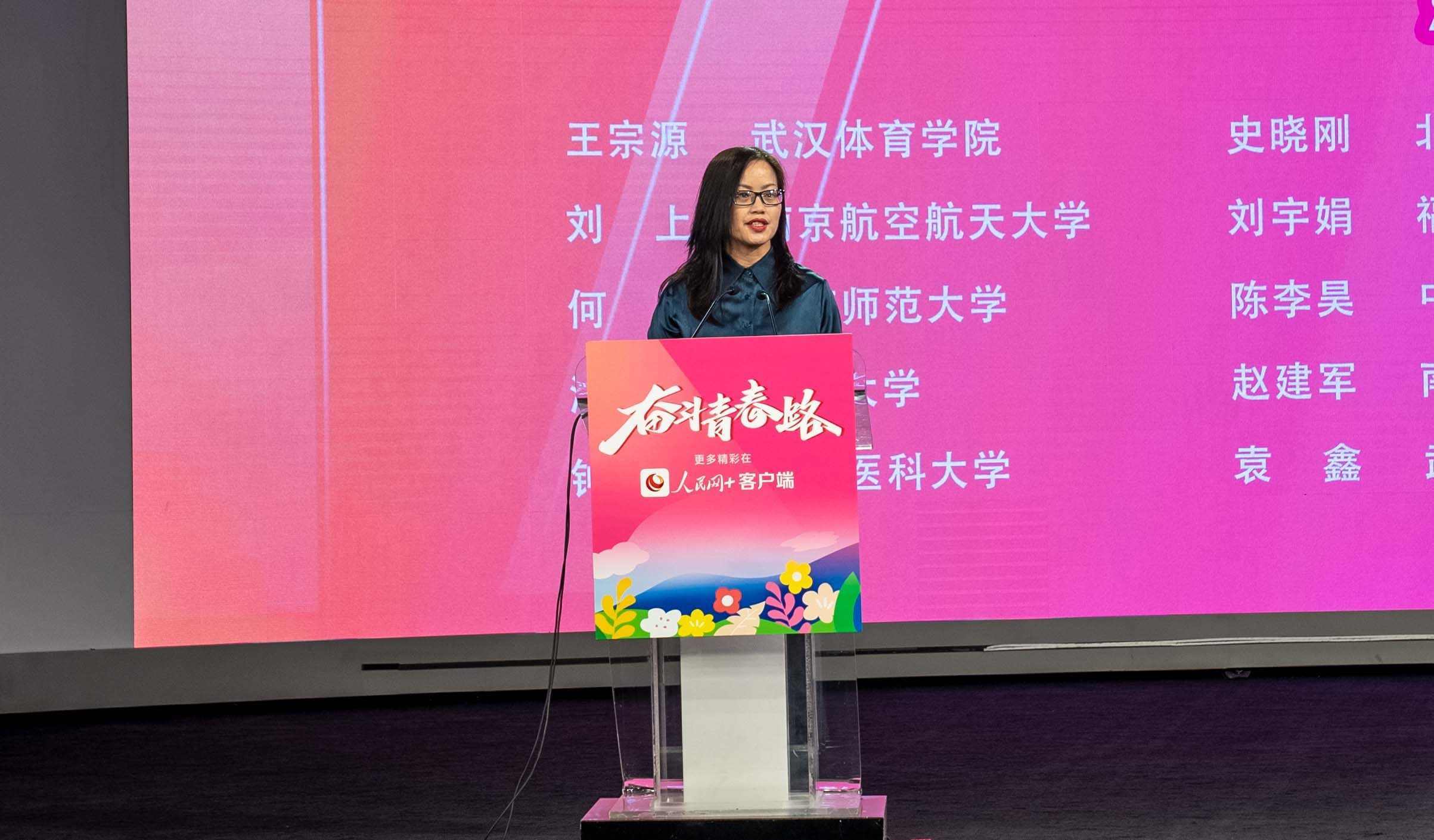 人民網(wǎng)黨委委員、副總裁潘?。ㄓ乙唬榈谑邔谩按髮W生年度人物”獲獎學生頒獎。實習生韓華良 攝