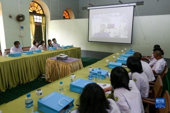 這是4月20日在緬甸仰光一所高中拍攝的“天宮對話”活動線上課堂現場。