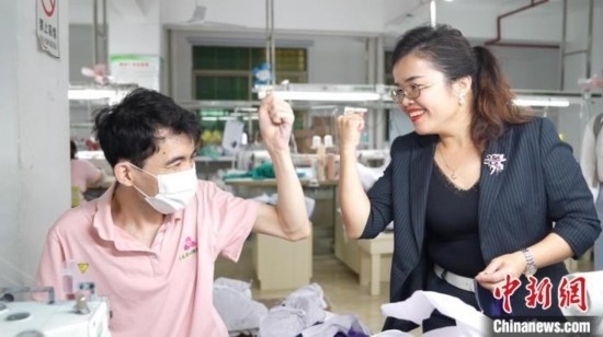 李王花說,解決殘疾人就業(yè)問題需要企業(yè)具有更多人文關(guān)懷。在制衣車間,有的員工邊工作邊聽音樂,溫情的企業(yè)氛圍讓許多殘障人士在這里找到了歸屬感和安全感。王康華自公司成立就在此工作,現(xiàn)在已是技術(shù)骨干?!皻埣踩艘羞^硬的技術(shù)才能獲得工作的機會。”他說,公司里殘疾人比較多,彼此之間互相幫助,大家還會一起做公益幫助他人,比起從前更加輕松快樂。