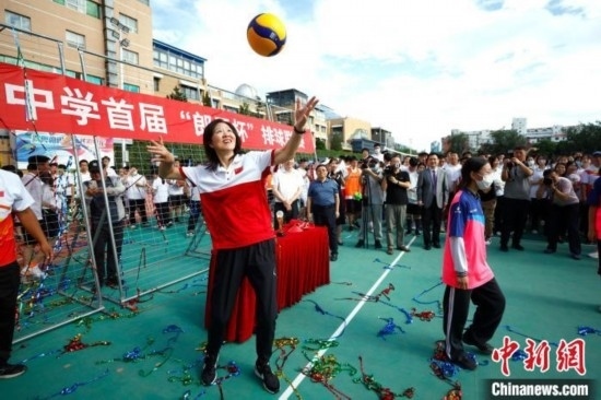 圖為郎平為陳經(jīng)綸中學首屆“郎平杯”排球聯(lián)賽開球。中新社記者 富田 攝