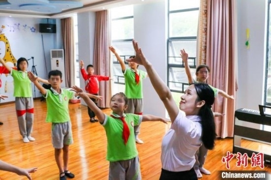 榮獲“廣東好人”稱(chēng)號(hào)的姚蘊(yùn)儀11日在廣東汕頭市潮南區(qū)特殊教育學(xué)校教聽(tīng)障孩子練習(xí)舞蹈。鐘欣 攝