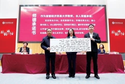 在加強思想政治建設方面,抓好思政課改革創(chuàng)新,在市屬高校率先全面開設“習近平新時代中國特色社會主義思想概論”課,獲批北京市首批重點建設馬克思主義學院。持續(xù)開展課程思政建設,得到市委教育工委的肯定性評價。聯(lián)動社會大課堂,成立大學生思想政治教育中心,與北大紅樓、中國人民抗日戰(zhàn)爭紀念館、長辛店二七紀念館等單位共建一批“大思政課”實踐教學基地。堅持“五育并舉”,促進學生全面發(fā)展。五年多來,學校獲評多項教育部和北京市課程思政建設獎項、北京高校“三全育人”優(yōu)秀成果、北京高?!笆演o導員”等榮譽。一批學生在文體比賽中獲省部級及以上獎勵,展現(xiàn)出新時代首經(jīng)貿(mào)學子的良好風貌。