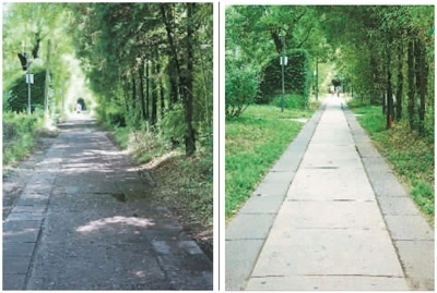 左圖:保護項目對燕南園水泥路修復前的景象。右圖:保護項目對燕南園水泥路進行修復后的效果。燕南園保存下來的水泥路以“脫漿彩石混凝土”工藝進行施工,老校友稱之為“洋灰路”。這里的“洋灰路”已有76年歷史,大部分仍能正常使用。北大建筑與景觀設計學院的李迪華老師發(fā)現,燕南園東側水泥路破損后,顯露出大小和顏色都參差不齊的石子。于是,他開始追溯這些“洋灰路”的歷史價值,與北大“燕園公益營建社”的黃可同學翻閱北大檔案館資料,找到了歷史照片。又幾經輾轉,尋訪到了九旬高齡的老校友。研究發(fā)現,燕園中最早的水泥路修建于1948年。為此,李迪華大力呼吁保護這些水泥路,尋訪到專門修復歷史路面的施工團隊,對少量保存完整的路面進行修復;破損的洋灰原料則被回收,取出原骨料,采用相同的工藝進行還原。不僅老材料得到循環(huán)利用,歷史道路的價值也“凝固”在更新后的路面中。