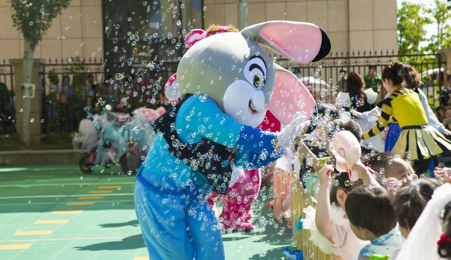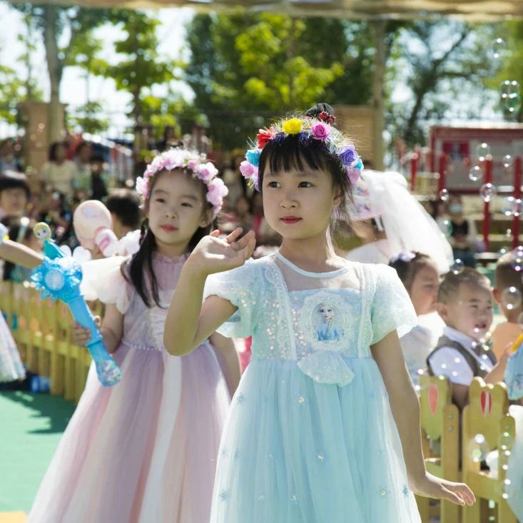 當(dāng)日,打扮成迪士尼童話里人物的老師們與盛裝打扮的小朋友們,共同手持泡泡機,在晶瑩剔透的泡泡里一起沉浸在童話世界里。