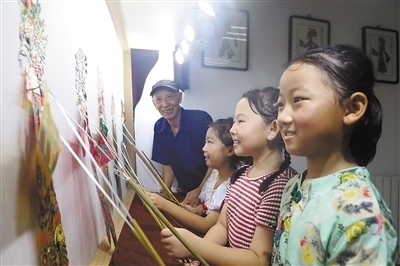 非遺體驗(yàn)河北省唐山市豐潤區(qū)浭陽街道華府社區(qū)開設(shè)“非遺”小課堂,小朋友們在學(xué)習(xí)表演皮影戲。 朱大勇攝(人民視覺)