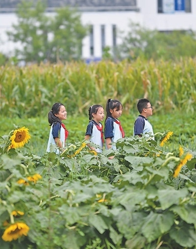 9月1日,天津師范大學第三附屬小學組織學生在校勞動種植基地,開展認識農(nóng)作物的開學第一課。新華社記者 李 然攝