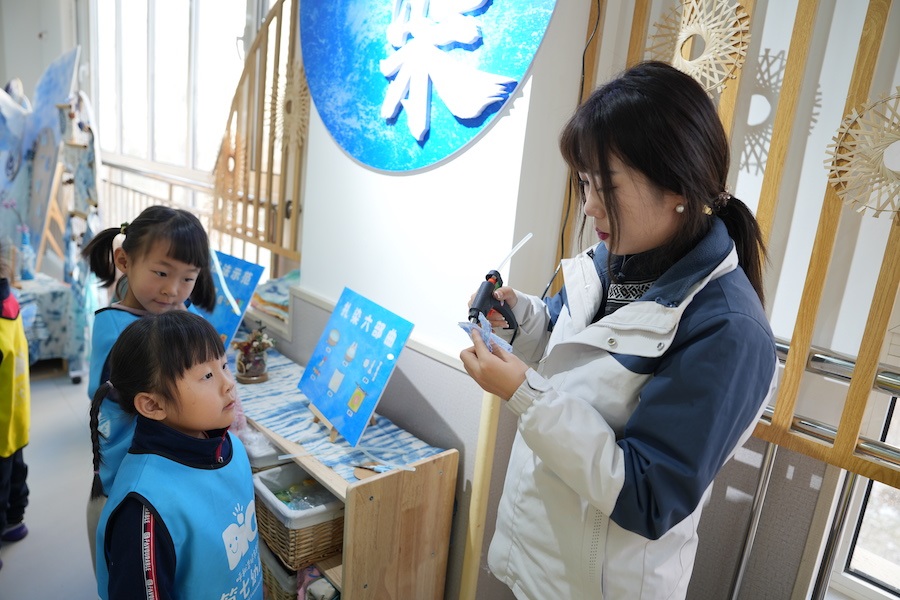 劉曉菲表示,利用幼兒園走廊寬的優(yōu)勢,把一樓打造成閱讀長廊,二樓藝術(shù)長廊,包括扎染、剪紙、造紙、拓印等非遺項(xiàng)目,三樓創(chuàng)造長廊,包括卡卡建構(gòu)、炫彩建構(gòu)、扭扭建構(gòu)、墻釘游戲、機(jī)械探索等。