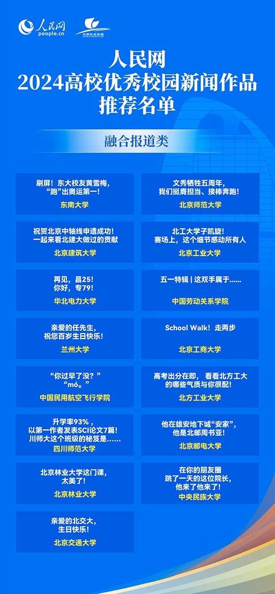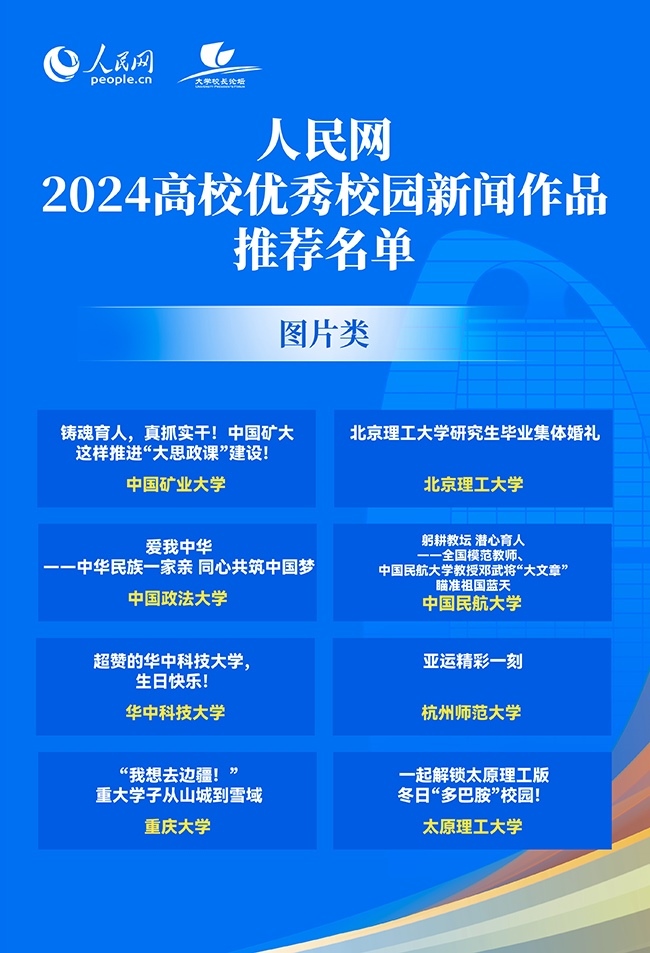 人民網(wǎng)北京12月27日電 (記者孫競、李依環(huán))以“推進(jìn)教育科技人才一體發(fā)展 加快建設(shè)教育強(qiáng)國”為主題的人民網(wǎng)2024大學(xué)校長論壇27日在人民網(wǎng)“初心”報告廳舉行。論壇上,人民網(wǎng)2024年高校優(yōu)秀校園新聞作品發(fā)布,50所高校作品入選。