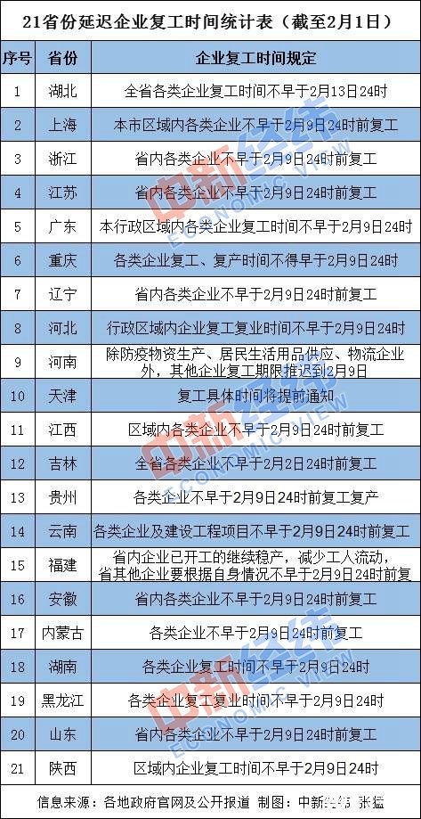 截至發(fā)稿時(shí),湖南、廣東、上海、重慶、江蘇、浙江、河南、河北、山東、安徽、貴州、云南、福建、遼寧、內(nèi)蒙古等19省份區(qū)域內(nèi)企業(yè)復(fù)工時(shí)間不得早于2月9日24時(shí),吉林不得早于2月2日24時(shí),湖北不得早于2月13日24時(shí)。