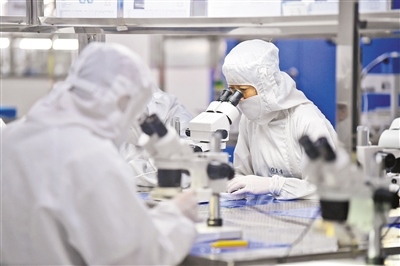 工人在包頭江馨微電機科技有限公司數(shù)字化百級無塵車間趕制配套5G手機產品的音圈馬達。