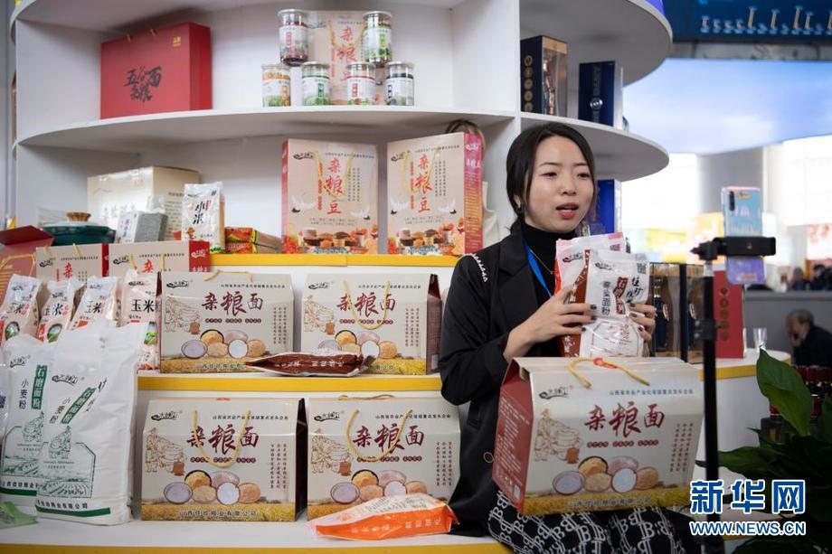 9月22日,一名參展商在位于山西省忻州市忻府區(qū)小檀村的雜糧產(chǎn)品展示展銷(xiāo)展廳內(nèi)進(jìn)行直播銷(xiāo)售。新華社記者 楊晨光 攝